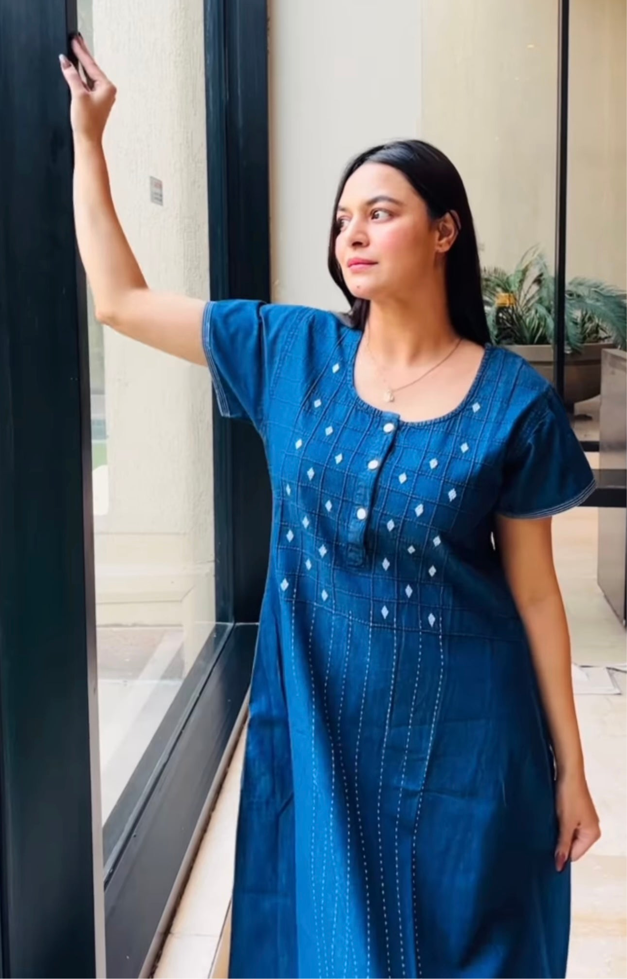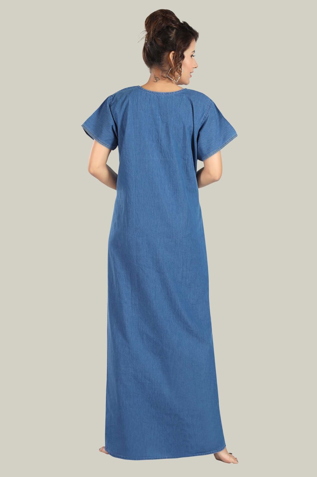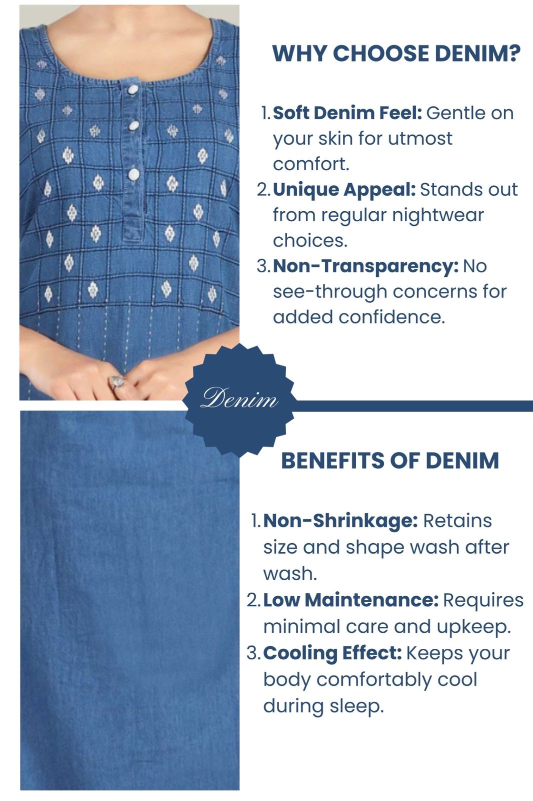 Experience ultimate comfort in our Ruby soft denim nightgown. Made from the softest denim, it ensures a peaceful night's sleep. The satin neckline and side pocket provides a touch of luxury and functionality.