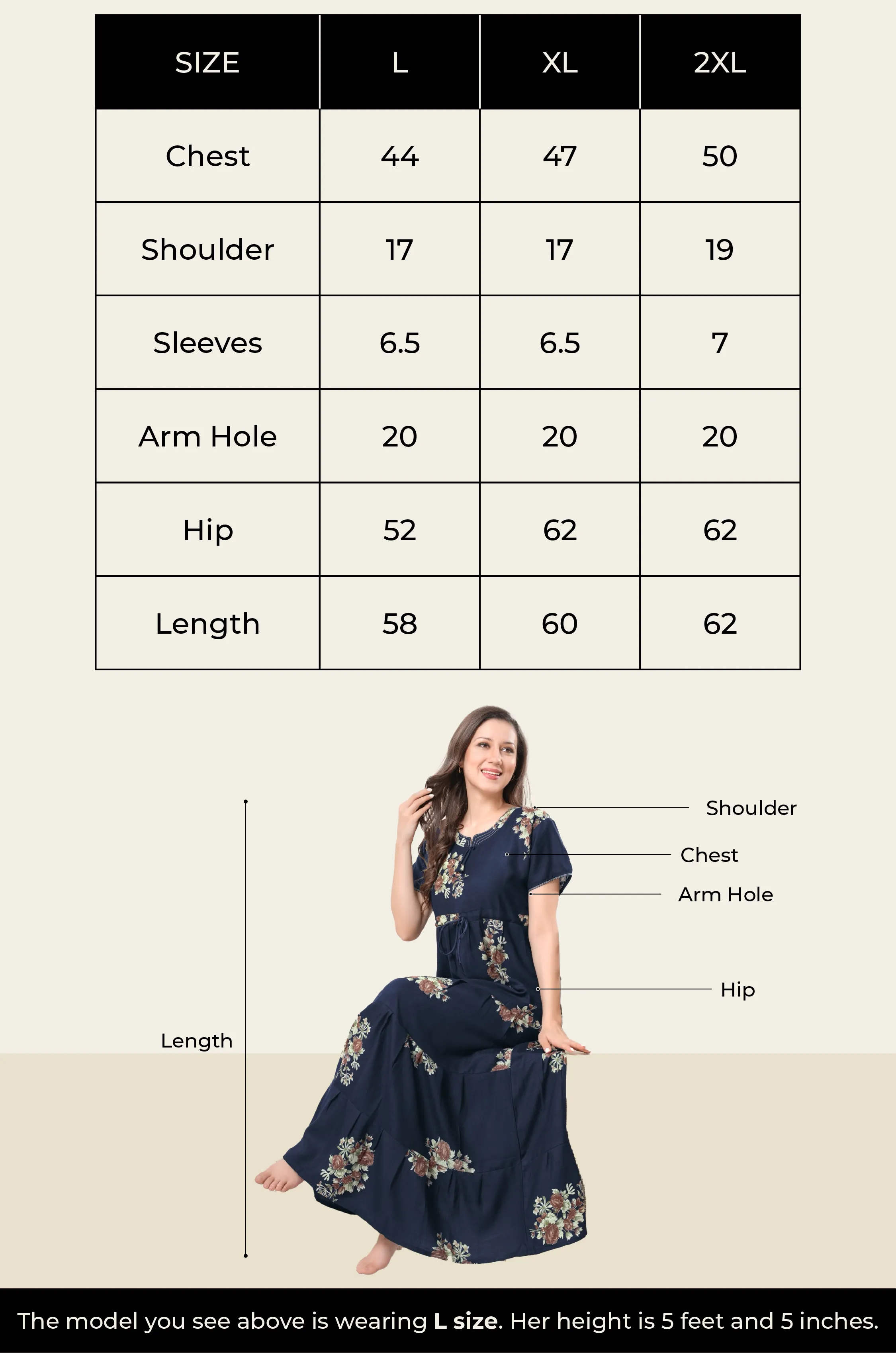 Our model is wearing size L and is 5 feet 5 inches tall.