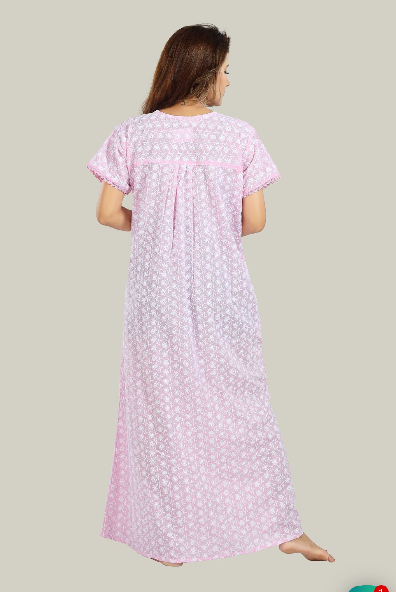 Amyra Chikankari nighty epitomizes tradition with delicate embroidery. The intricate chikankari adorns the neck, showcasing exquisite craftsmanship. The fabric becomes a canvas for this classic elegance, making it a timeless wardrobe addition.