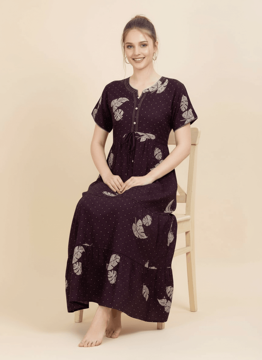 Experience the Priyanka nightgown: a premium Supima Cotton Umbrella Nightgown designed for effortless comfort and timeless elegance. Crafted from the finest Supima Cotton, it’s a zero-maintenance piece — no shrinkage, no color bleeding, and absolutely no ironing needed. Its unique three-layer umbrella flare gives it a beautiful flow and adds a touch of everyday luxury. Perfect to lounge in or wear throughout the day, the Aarohi nightgown combines comfort with chic sophistication.