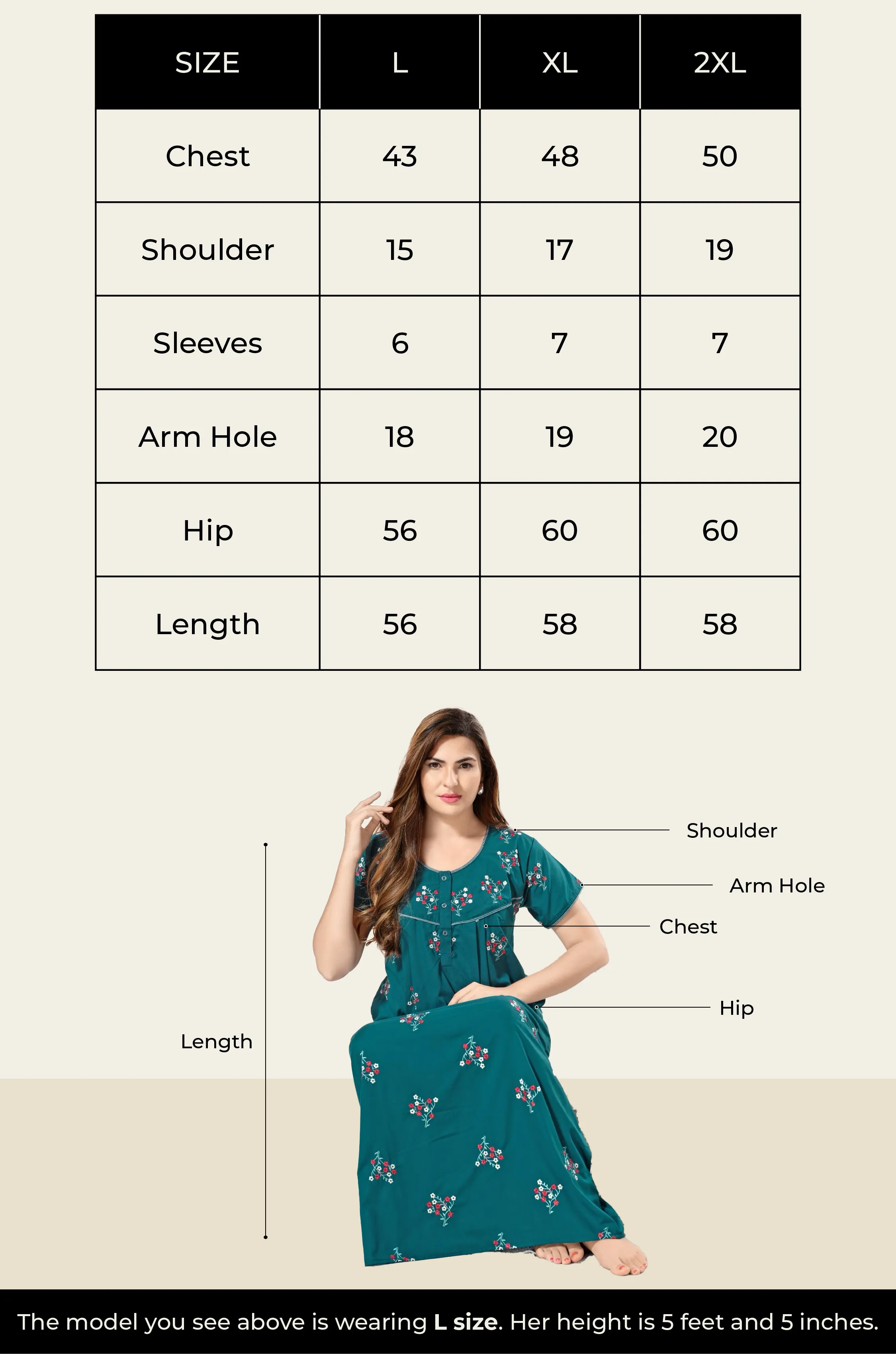 Our model is wearing size L and she is 5 feet and 5 inches
