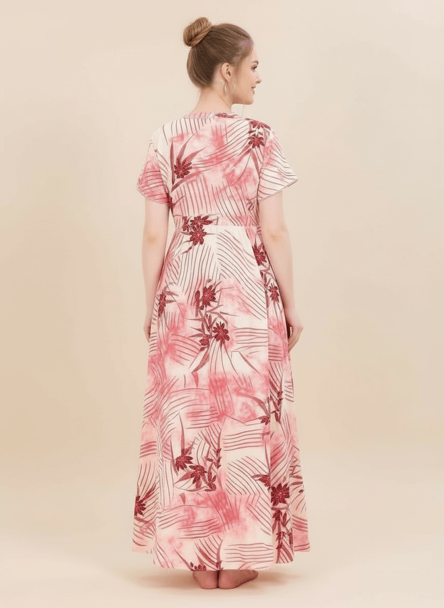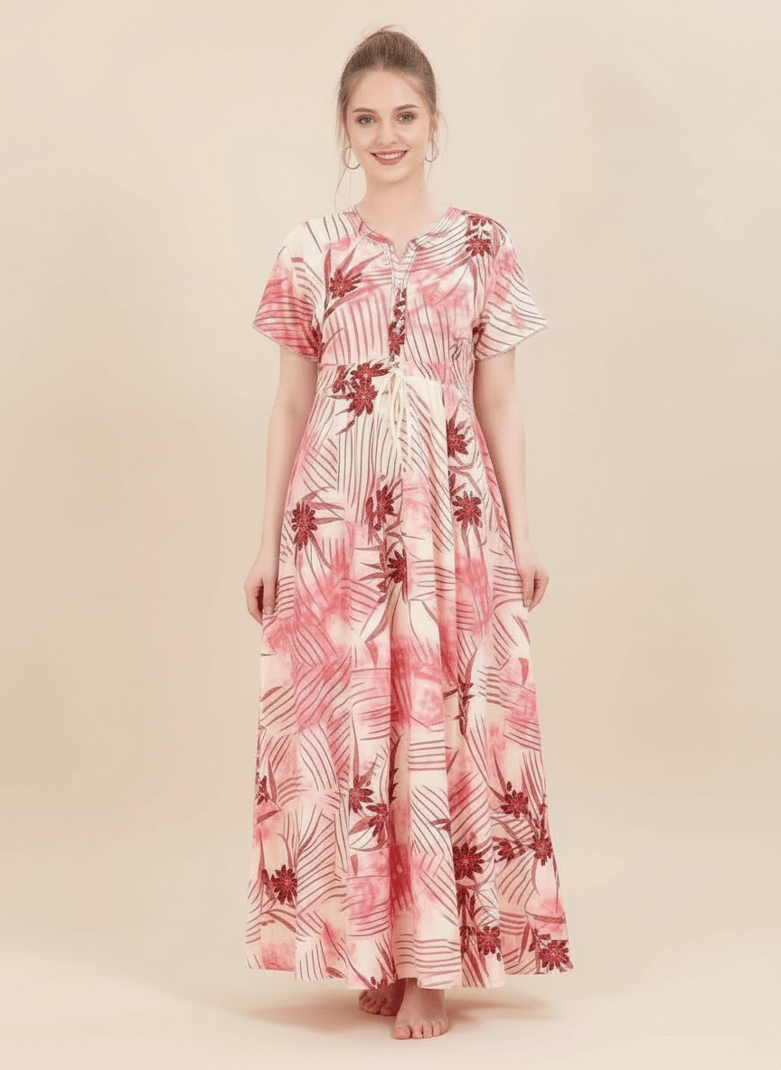 Experience the Shruti nightgown: a premium Supima Cotton Umbrella Nightgown designed for effortless comfort and timeless elegance. Crafted from the finest Supima Cotton, it’s a zero-maintenance piece — no shrinkage, no color bleeding, and absolutely no ironing needed. Its unique three-layer umbrella flare gives it a beautiful flow and adds a touch of everyday luxury. Perfect to lounge in or wear throughout the day, the Aarohi nightgown combines comfort with chic sophistication.