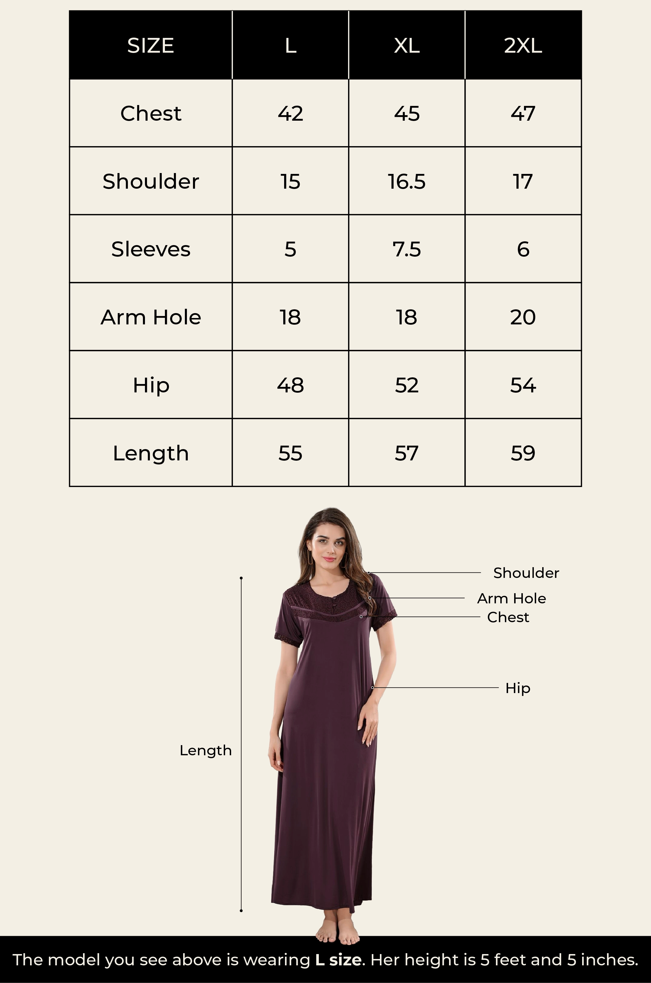 Our model is wearing size L and she is 5 feet 5 inches tall.