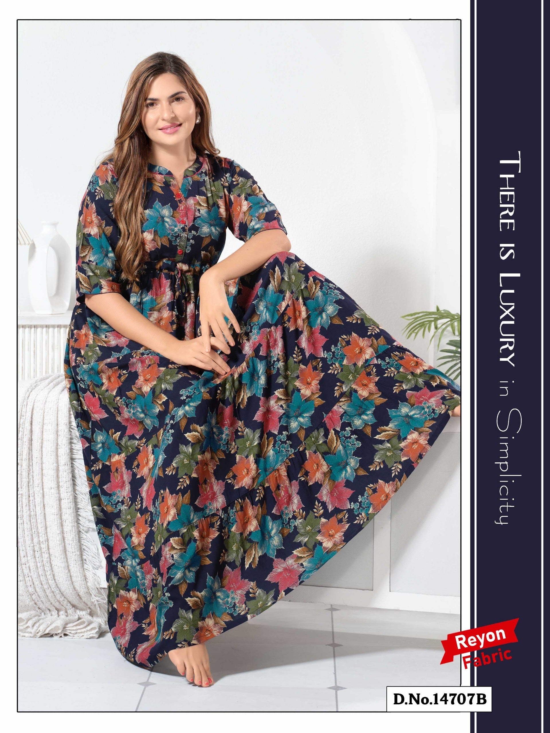 Experience the Misha nightgown: a premium Reyon Cotton Umbrella Nightgown designed for effortless comfort and timeless elegance. Crafted from the finest Reyon Cotton, it’s a zero-maintenance piece with no colour bleeding issues. Its unique three-layer umbrella flare gives it a beautiful flow and adds a touch of everyday luxury. Perfect to lounge in or wear throughout the day, the Misha nightgown combines comfort with chic sophistication.