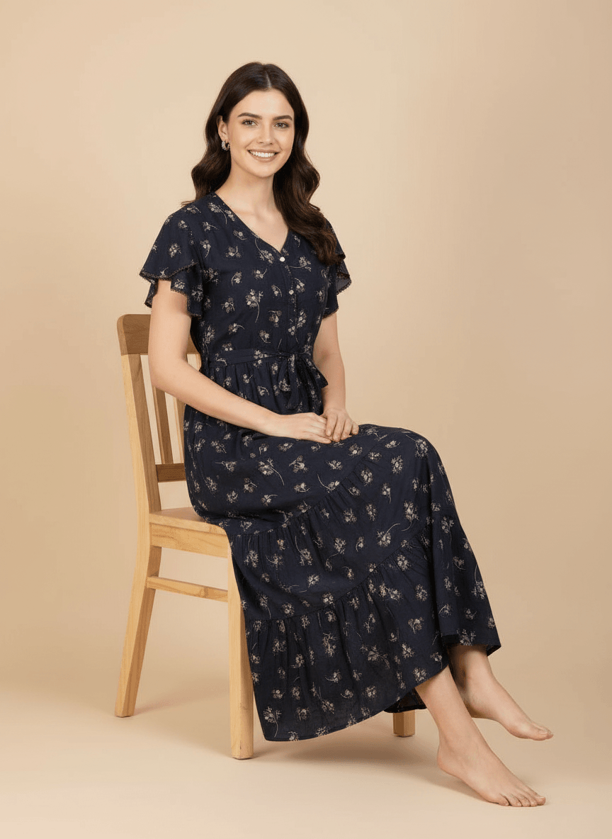 Experience the Siya nightgown: a premium Supima Cotton Umbrella Nightgown designed for effortless comfort and timeless elegance. Crafted from the finest Supima Cotton, it’s a zero-maintenance piece — no shrinkage, no color bleeding, and absolutely no ironing needed. Its unique three-layer umbrella flare gives it a beautiful flow and adds a touch of everyday luxury. Perfect to lounge in or wear throughout the day, the Aarohi nightgown combines comfort with chic sophistication.
