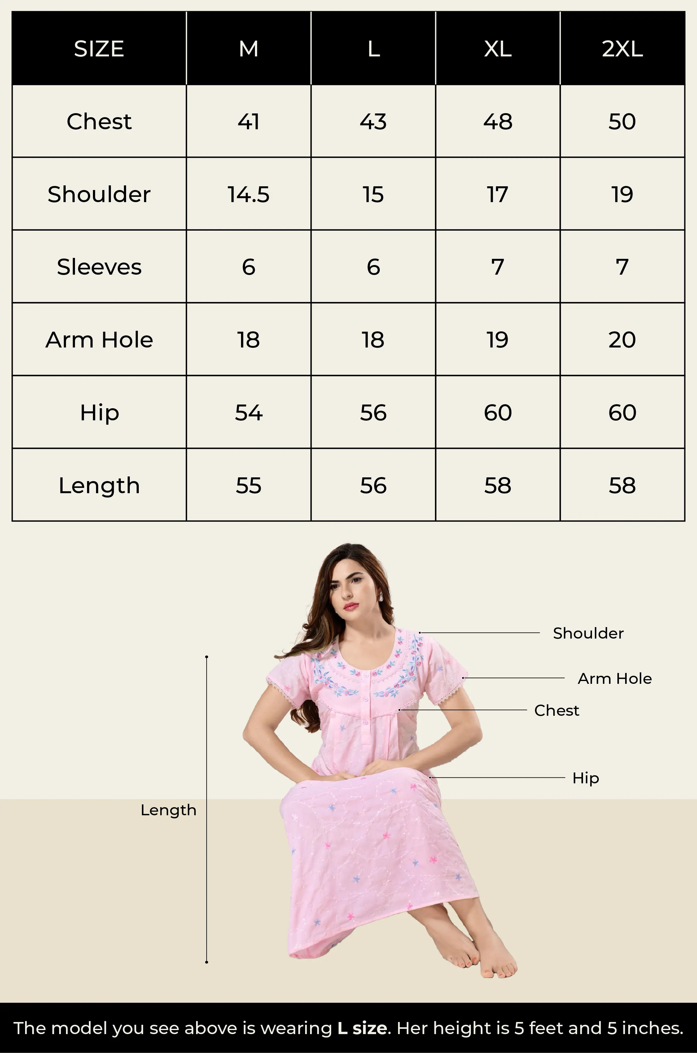 Elora Chikankari nighty epitomizes tradition with delicate embroidery. The intricate chikankari adorns the neck, showcasing exquisite craftsmanship. The fabric becomes a canvas for this classic elegance, making it a timeless wardrobe addition.