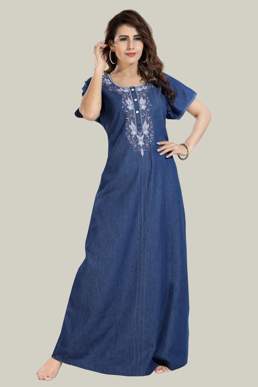 Experience ultimate comfort in our Aria soft denim nightgown. Made from the softest denim, it ensures a peaceful night's sleep. The satin neckline and side pocket provides a touch of luxury and functionality.
