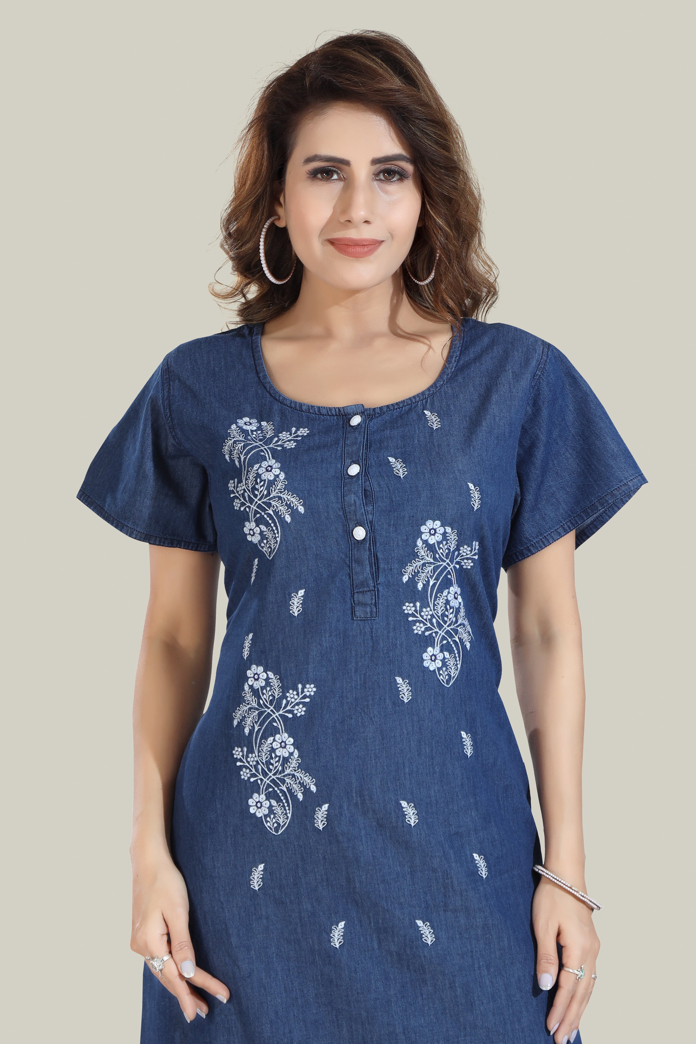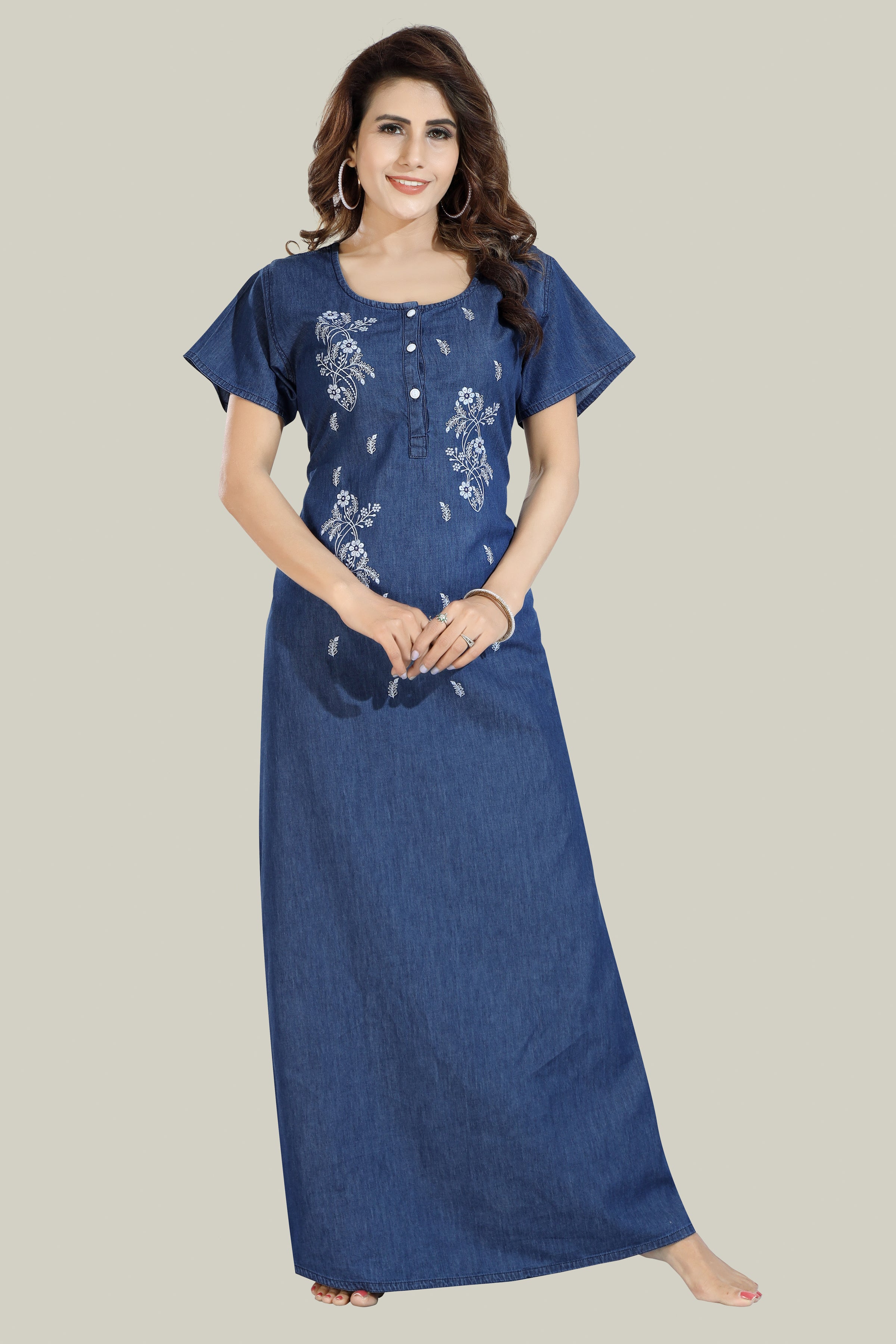Experience ultimate comfort in our Reya soft denim nightgown. Made from the softest denim, it ensures a peaceful night's sleep. The satin neckline and side pocket provides a touch of luxury and functionality.