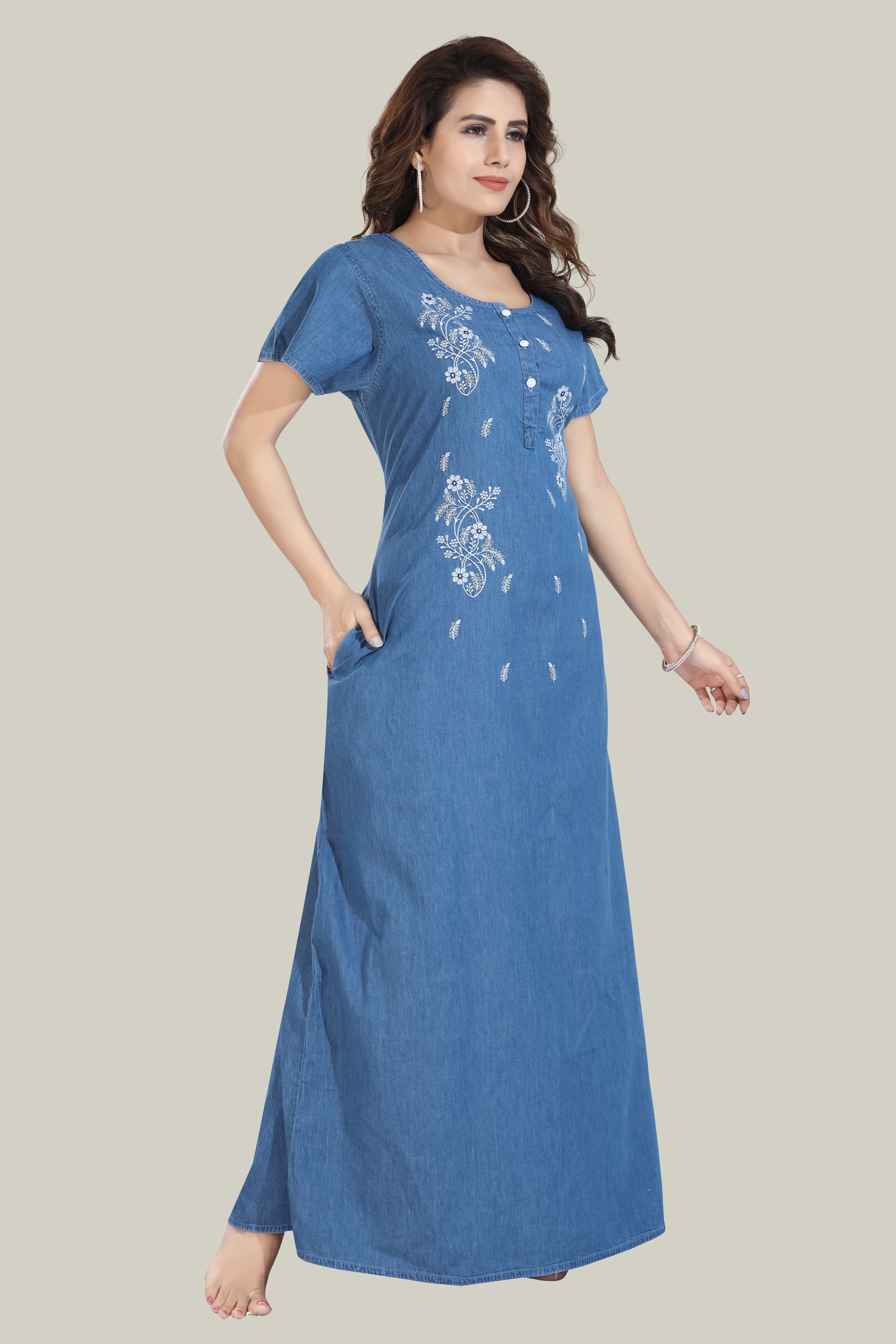 Experience ultimate comfort in our Reya soft denim nightgown. Made from the softest denim, it ensures a peaceful night's sleep. The satin neckline and side pocket provides a touch of luxury and functionality.