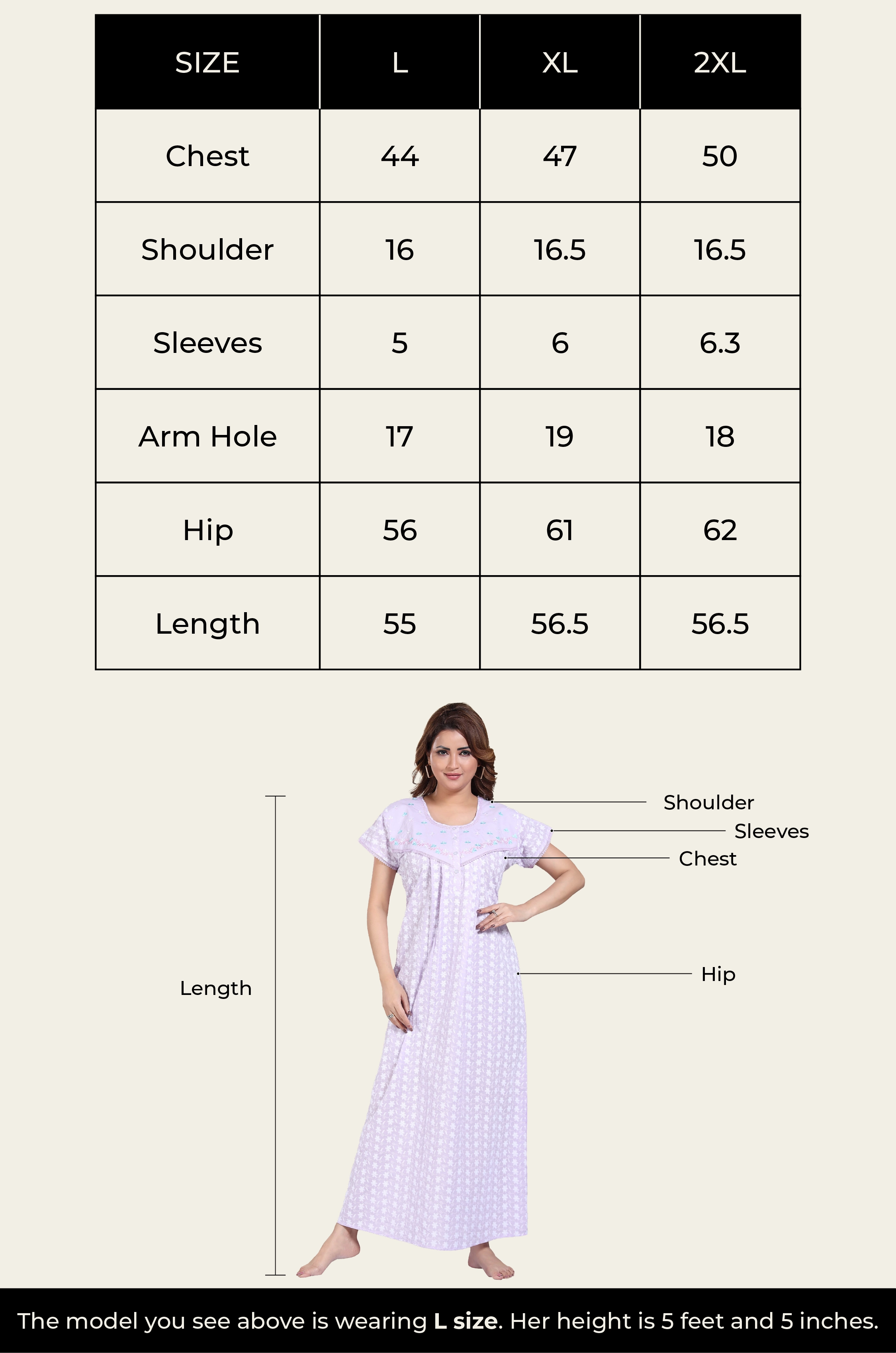 Lucy Chikankari nighty epitomizes tradition with delicate embroidery. The intricate chikankari adorns the neck, showcasing exquisite craftsmanship. The fabric becomes a canvas for this classic elegance, making it a timeless wardrobe addition.